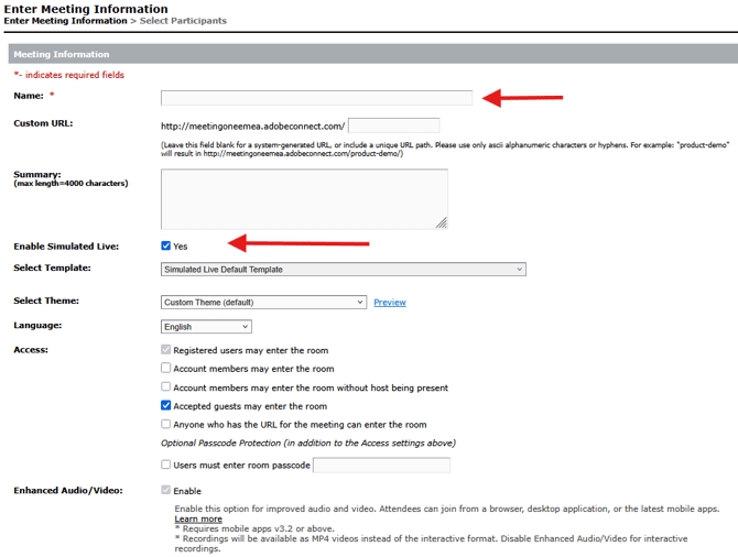 - In the Adobe Connect seminar room creation form, in addition to the usual fields (room Name, Custom URL, Select Theme, Language, etc.), check the Enable Simulated Live: _ Yes option (once the room is created, this option cannot be changed and disappears from the room editing form). As soon as this option is checked, two options become grayed out: