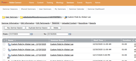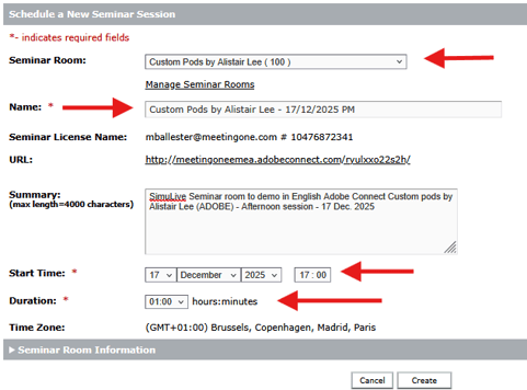 From the Seminar Information page of your SimuLive webinar room, simply click on the Sessions link, then on the New Seminar Session button, and then complete the form.