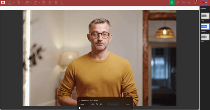 The Seminar Room preparation interface will then be replaced by the Simulated Live interface, and the live stream will start immediately on the first Playback layout, unless it was configured during the preparation phase that the SimuLive sessions start with a default delay of 1 to 5 minutes. In the latter case, everyone will remain on the Lobby layout for 1 to 5 minutes (depending on the configuration) before switching to the first Playback layout.