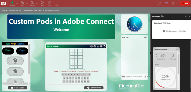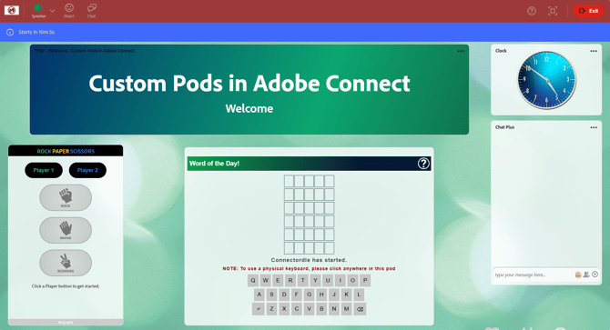 For instance: Titler, Clock, Rock Paper Scisors, Connectordle, Chat Plus... - These are custom pods; usual pods such as Chat, Q&A, Poll... can also be used.- The custom pod Coundown Timer is not very useful in the Lobby layout because a grey or blue banner (depending on whether it is the Host or Participant screen), intrinsic to the SimuLive room, will indicate to everyone how much time is left before the session starts.