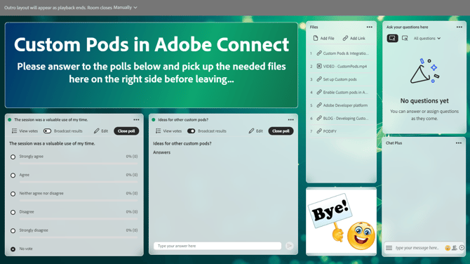 - Outro: wraps up the session with final messaging, survey, resources to share, eventual next steps, etc., and this after all the prerecorded video content has been played.