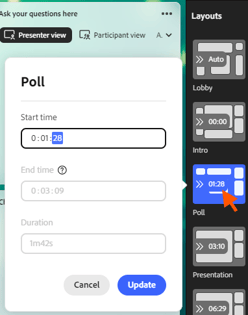 Once the playback is paused at the right moment, or the cursor is moved to the correct duration (even if approximate), click the Split layout button. This will duplicate the current layout.- If the prerecorded video was split approximately, it can be refined. The Playback layout thumbnail (here, Poll) shows the time at which the layout will start. By clicking on the selected layout time, you can manually change the layout's Start time (don't forget to click the Update button afterward).