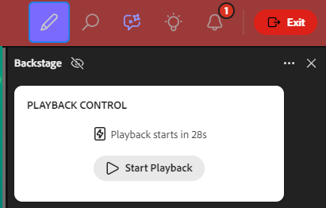 During the broadcast, you can pause playback at any time from the Backstage area (PLAYBACK CONTROL). The Microphone and Camera buttons will then appear in their usual positions in the room's button and menu banner.