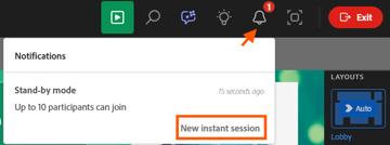 This New instant session button appears in the Stand-by mode Notifications window informing you of the session limit of 10 attendees, as soon as you enter the seminar room when the session is not scheduled, or by clicking on the Notifications icon