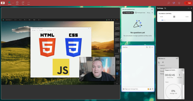- Presentation layout: large Prerecorded video + Q&A, Chat.